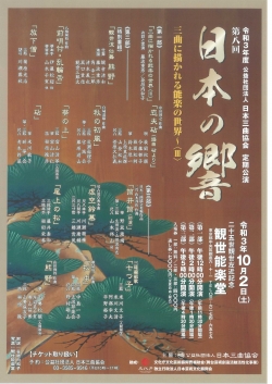 三曲に描かれる能楽の世界~<Ⅲ> ≪第1部≫12時開演(11時30分開場) 「三曲に描かれる能楽の世界<Ⅲ>」 ≪第2部≫14時開演(13時30分開場) 「観世流仕舞 熊野」「前唄付・乱輪舌」「放下僧」「恋夫砧 (謡曲 砧より)」「秋の初風」「葵の上」「砧」 ≪第3部≫17時開演(16時30分開場) 「筒井筒(初演)」「虚空鈴慕」「尾上の松」 三味線組歌「七つ子」「松虫」「熊野」 |