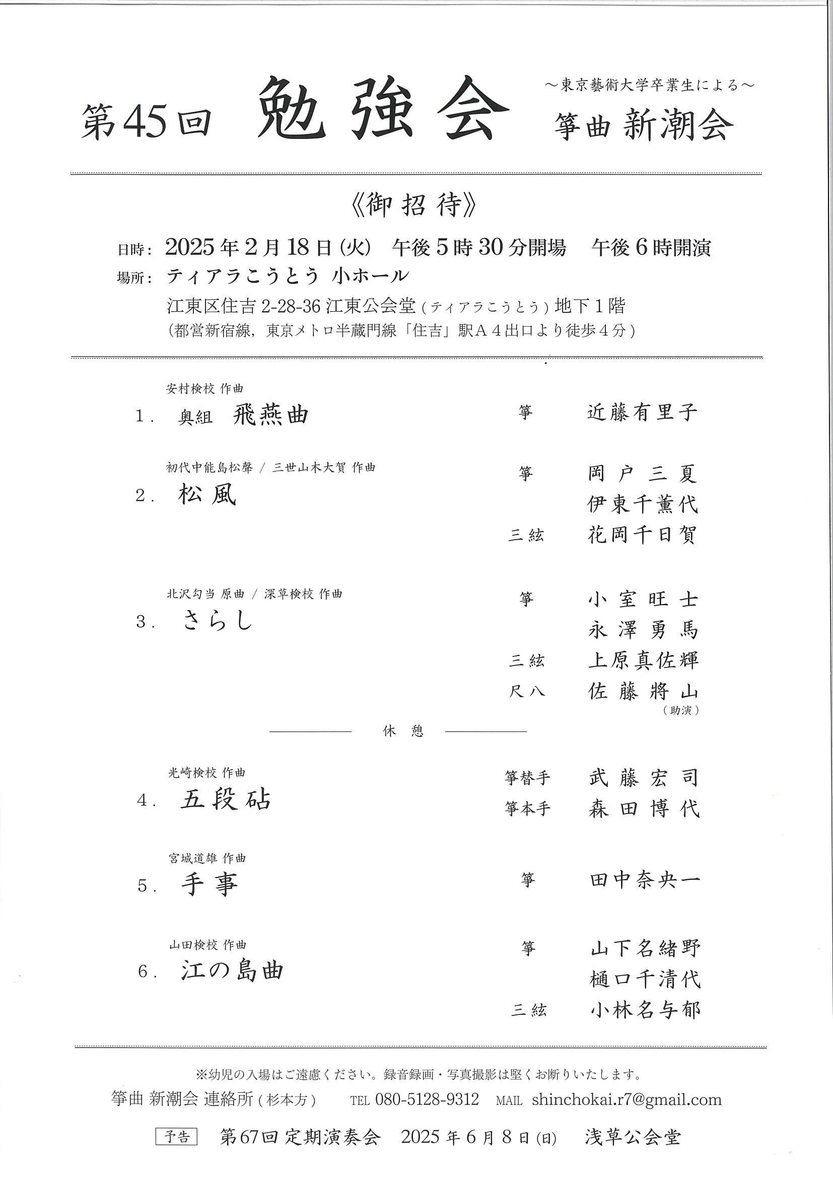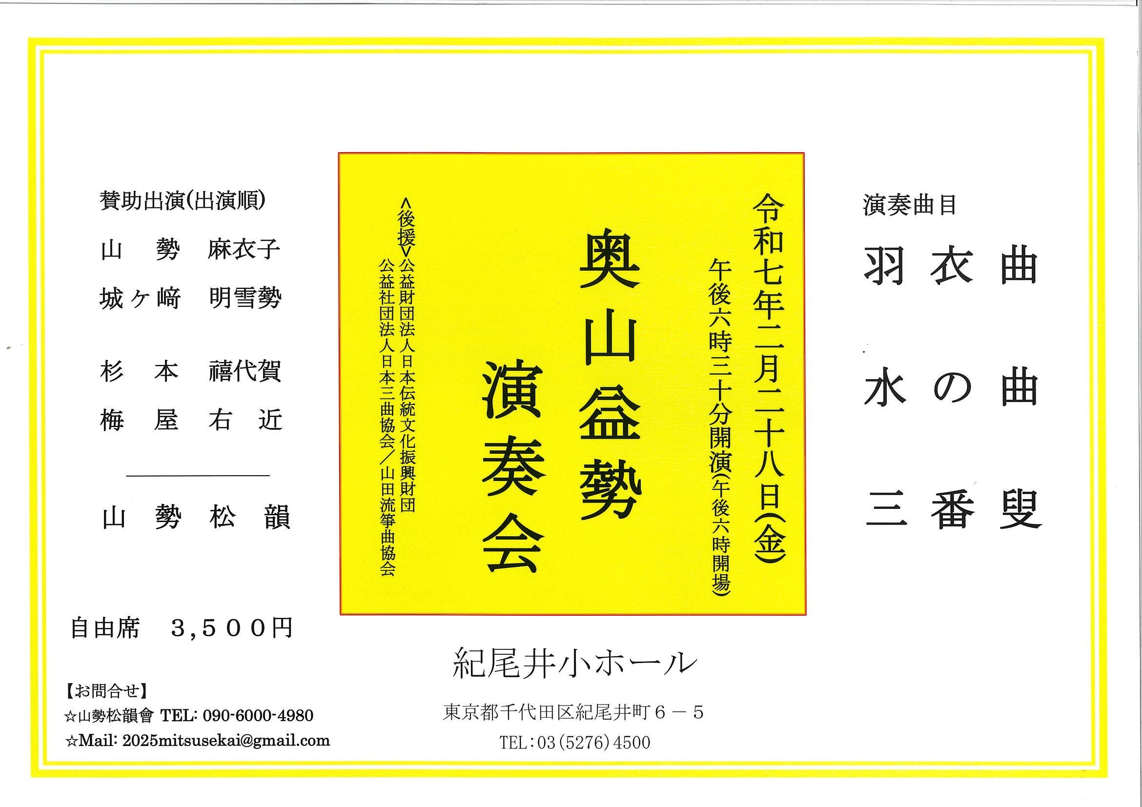 | 後援 | 公益社団法人 日本三曲協会 / 日本伝統文化振興財団 / 山田流箏曲協会 |