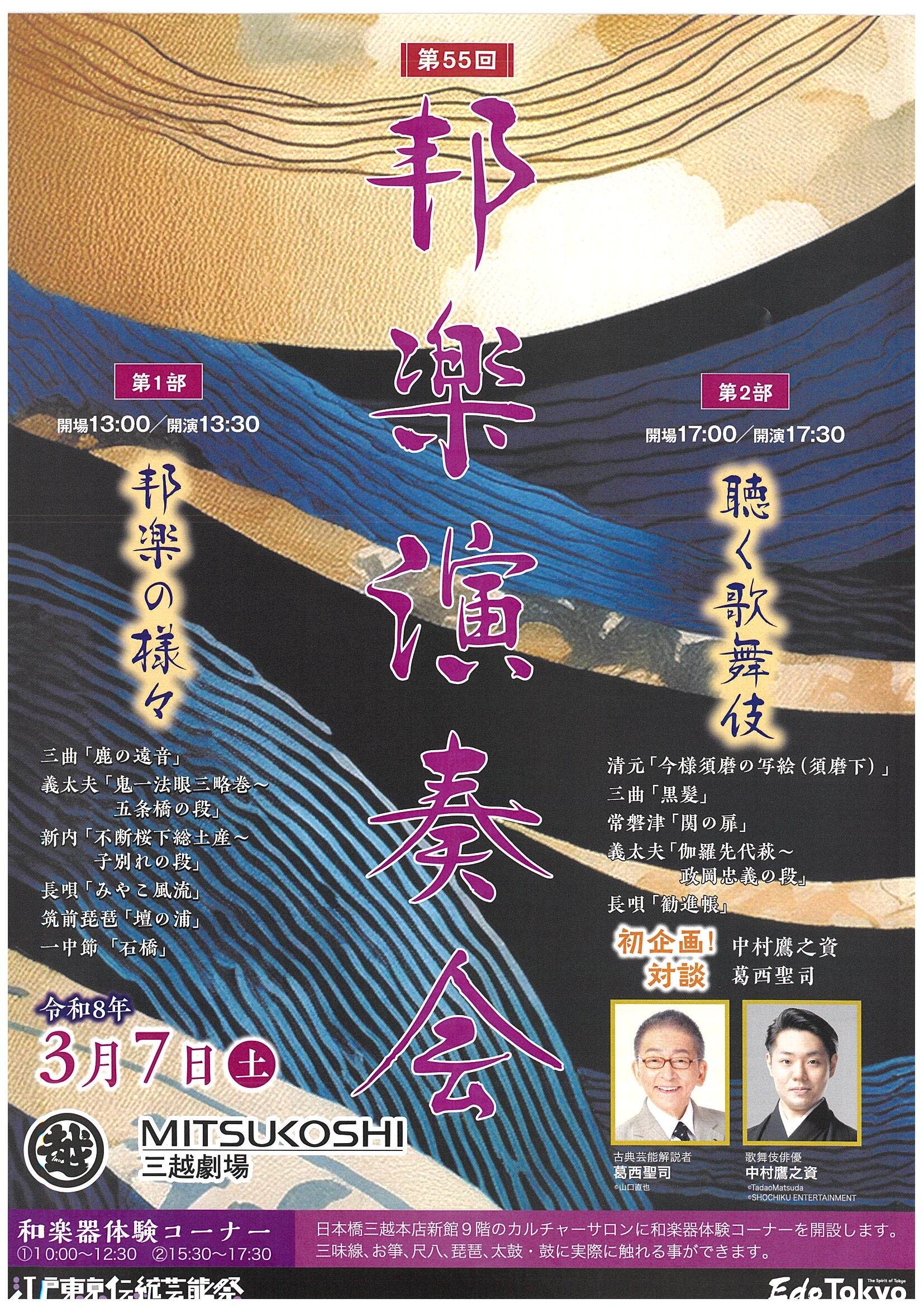 | 出演 | 尺八;青木鈴慕、川瀨庸輔、三曲;唄・三絃 藤井泰和 胡弓 川瀬露秋 義太夫、新内、長唄、筑前琵琶、一中節、清元、常磐津の演奏が行われます。 また、歌舞伎俳優との対談も行われます。 |