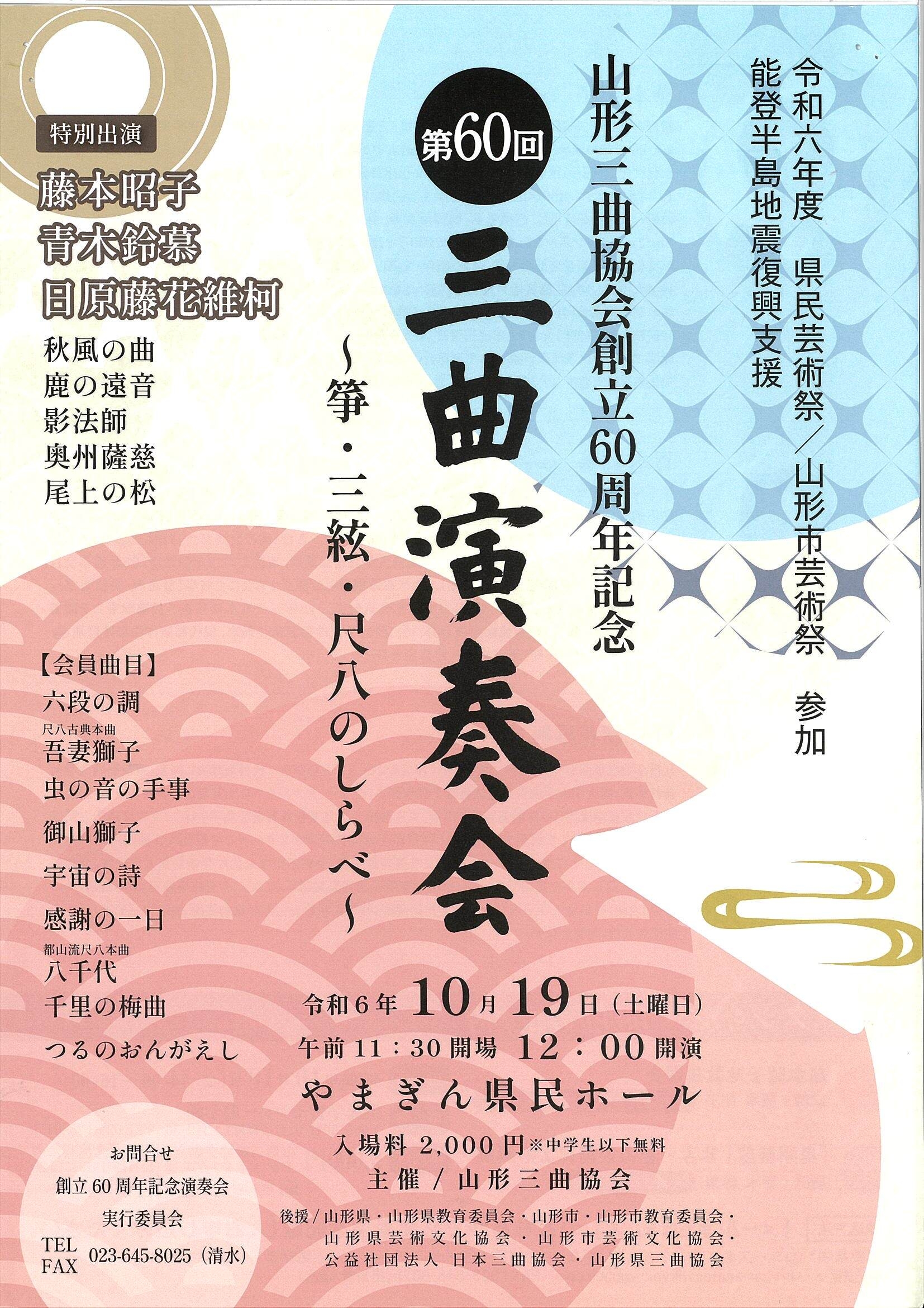 | 後援 | 公益社団法人 日本三曲協会 / 山形県三曲協会 / 山形県教育委員会 / 山形市教育委員会 / 山形県芸術文化協会 / 山形市芸術文化協会 |