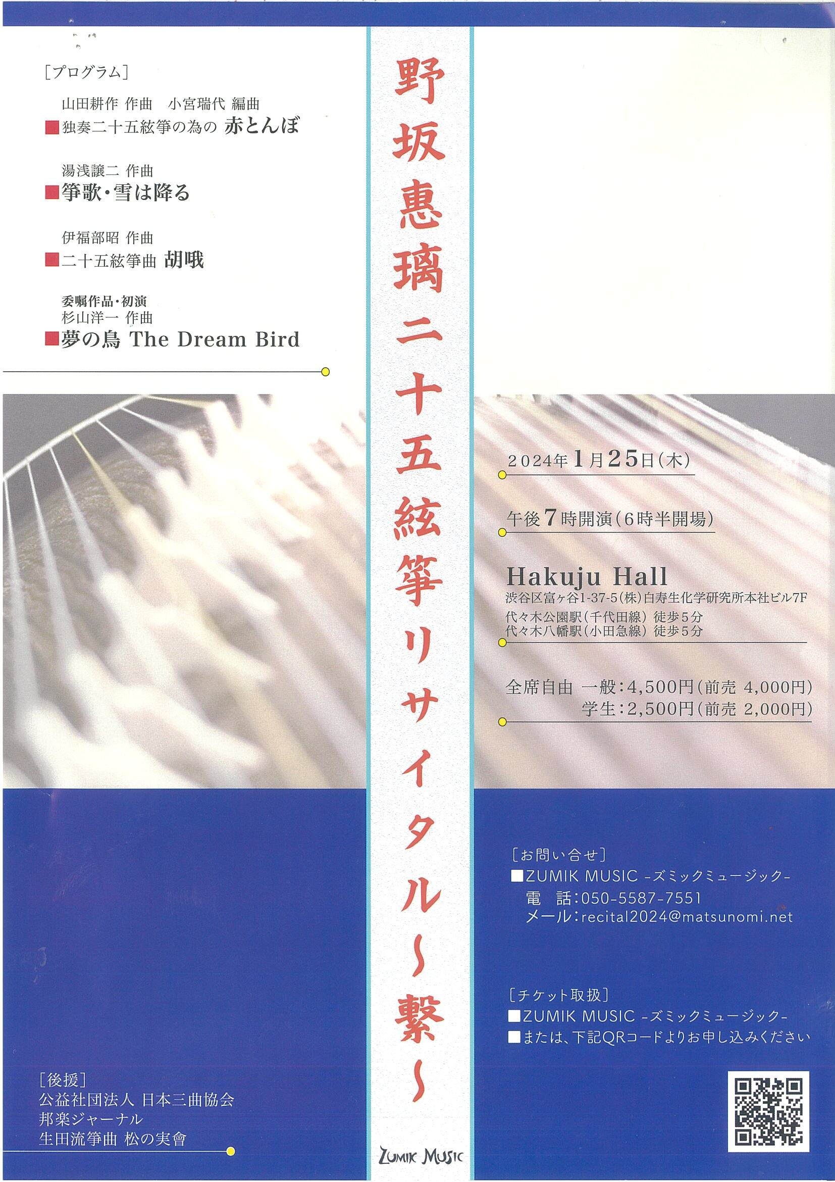 | お問い合わせ先 | ZUMIK MUSIC TEL :050-5587-7551 MAIL:recital2024@matsunomi.net |