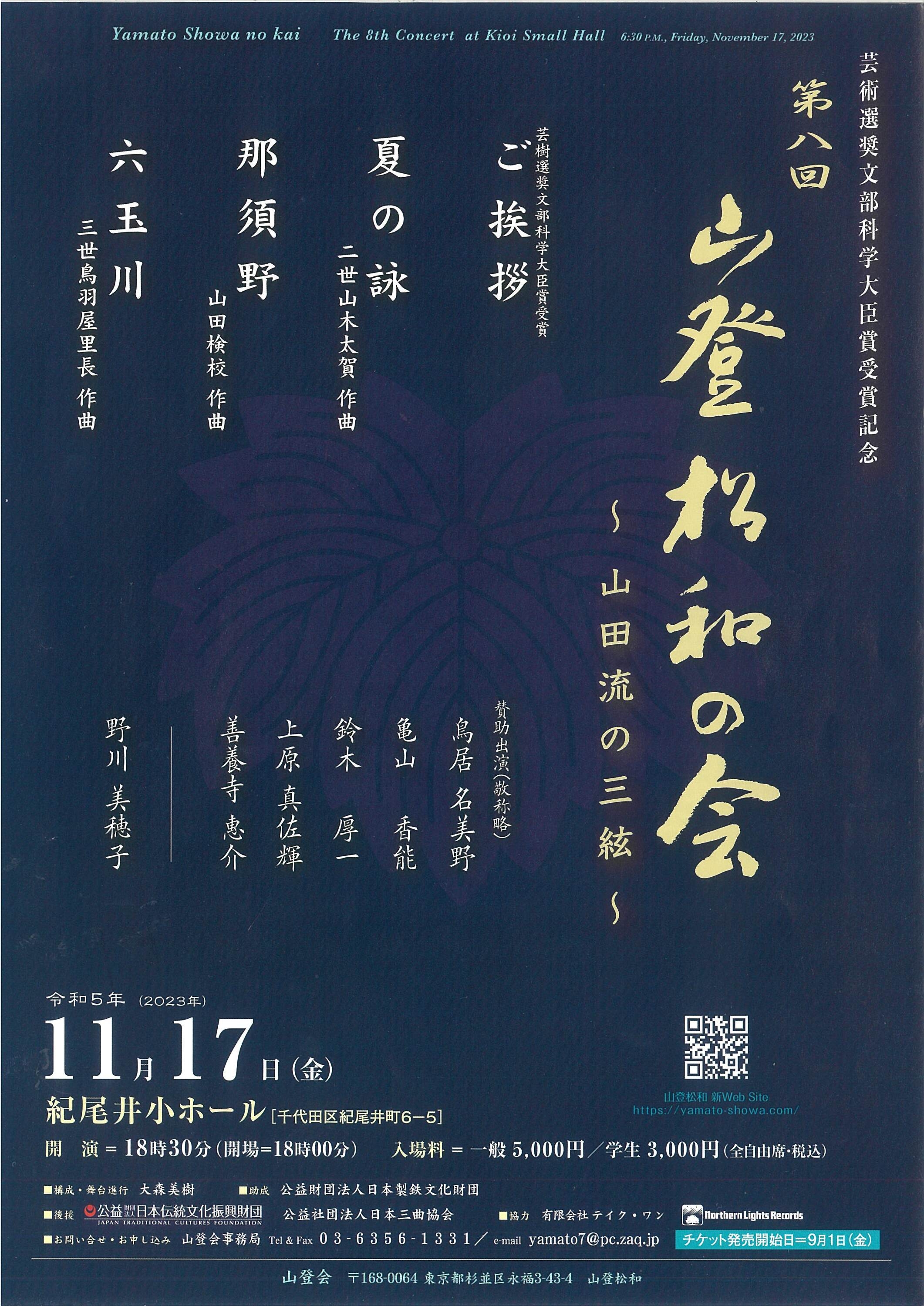 | 後援 | 公益財団法人 日本伝統文化振興財団 / 公益財団法人 ポーラ伝統文化振興財団 / 公益社団法人 日本三曲協会 / 三ッの音会 |