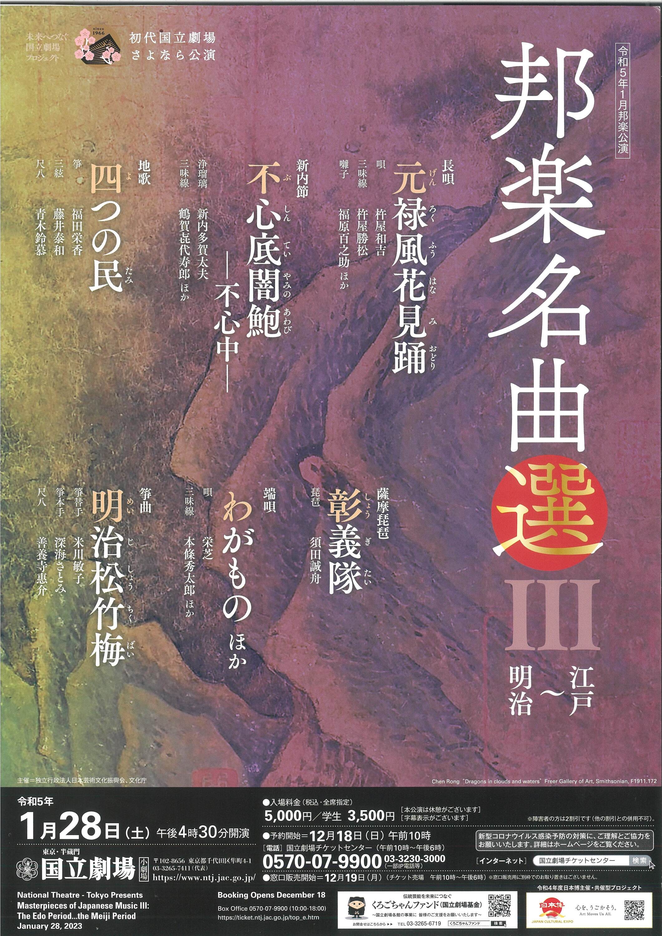 | お問い合わせ先 | 国立劇場チケットセンター(10時~18時) 予約開始:12/18(日)~ TEL:0570-07-9900 / 03-3230-3000 |