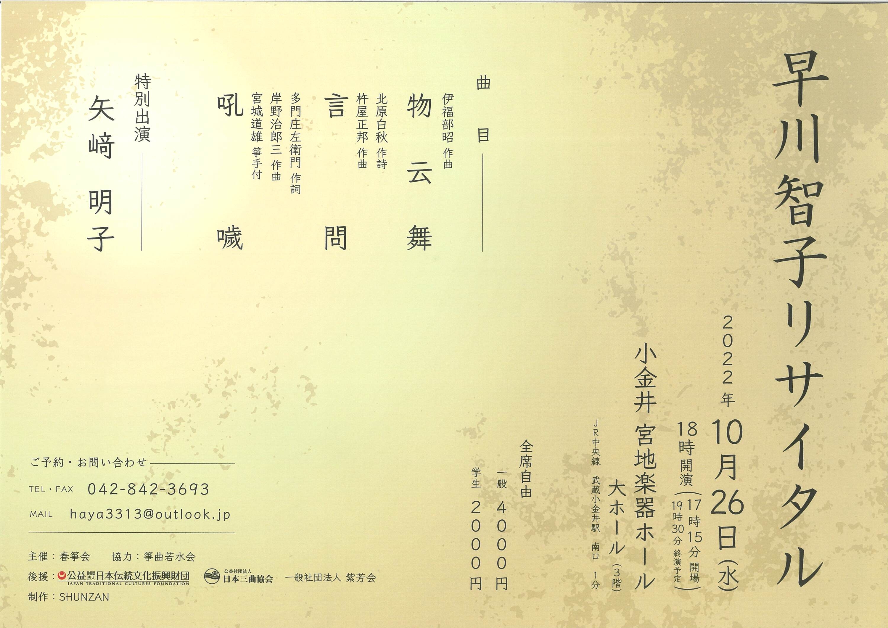 | 後援 | 公益財団法人 日本伝統文化振興財団 / 公益社団法人 日本三曲協会 / 一般社団法人 紫芳会 |