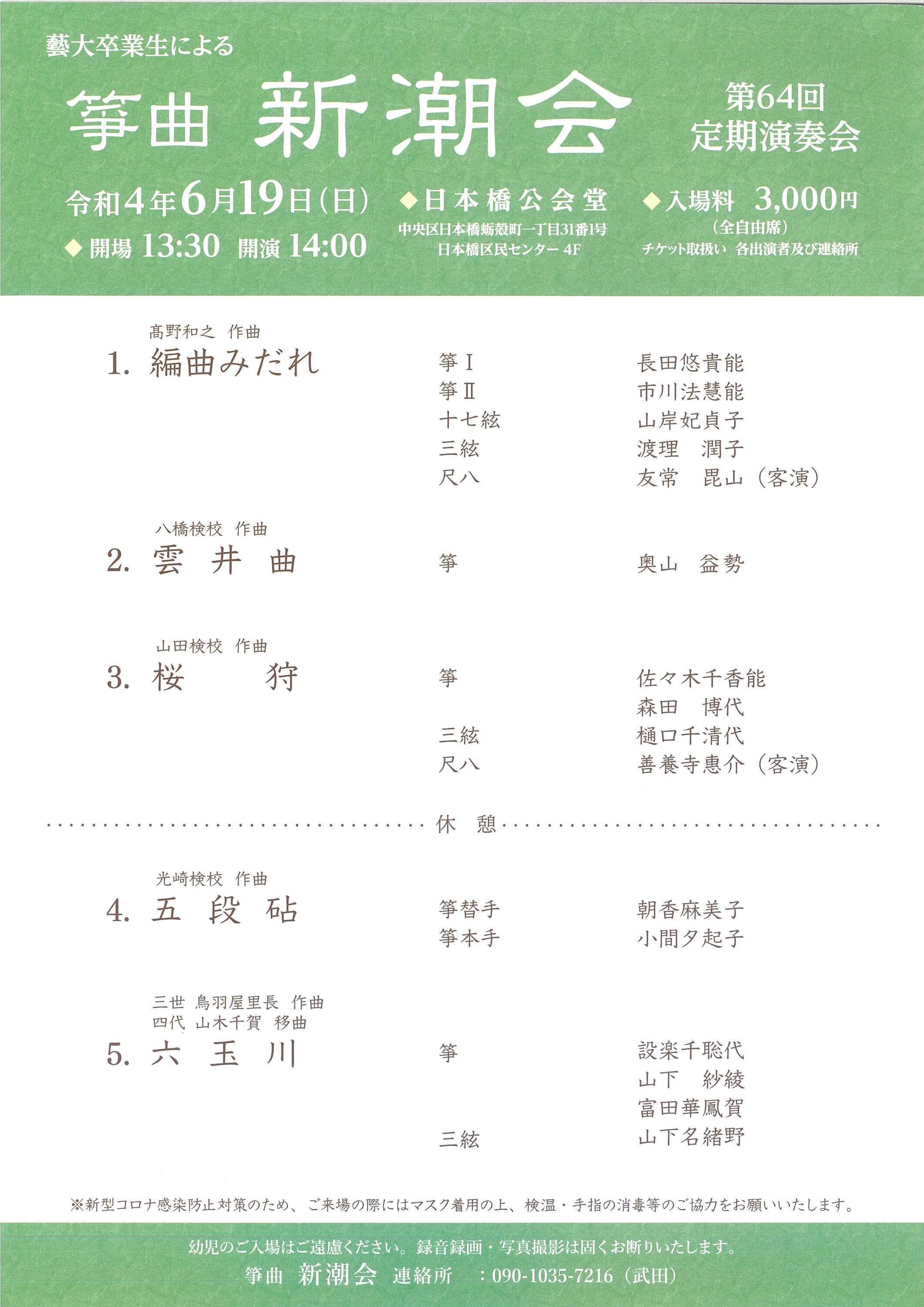 藝大卒業生による 箏曲 新潮会 第64回 定期演奏会 1. 編曲みだれ 2. 雲井曲 3. 桜 狩 休憩 4. 五段砧 5. 六玉川 |