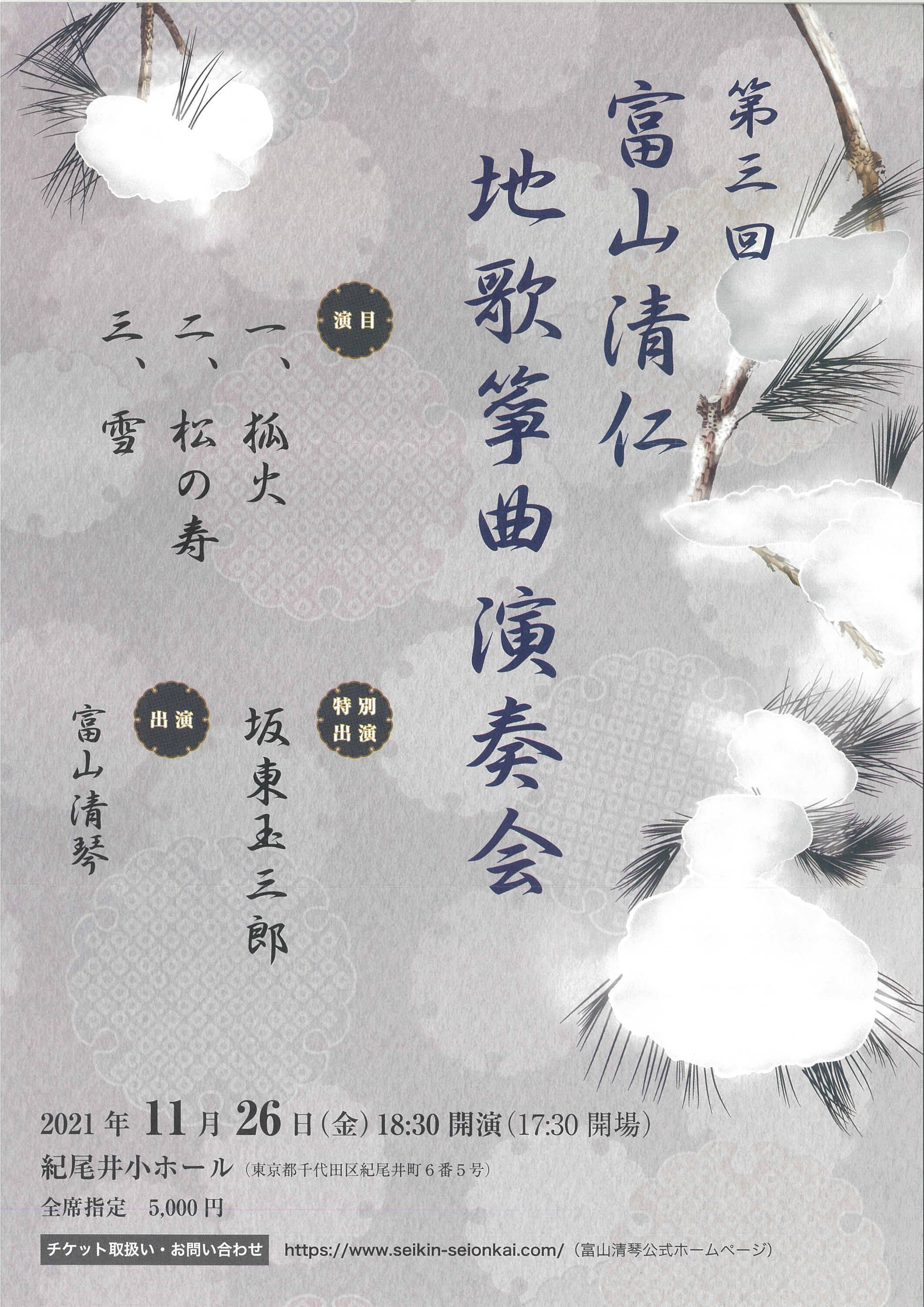 | お問い合わせ先 | 公益社団法人 日本三曲協会 :TEL 03-3585-9916(平日10時~17時) 紀尾井町ホールチケットセンター:TEL 03-3237-0061 |